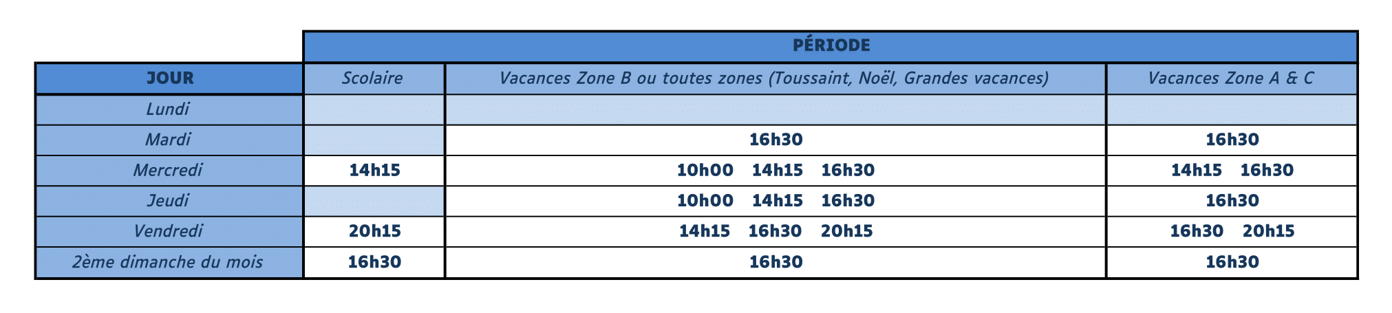 Nous vous invitons à consulter ce programme pour connaître les horaires des prochaines séances et ne pas manquer votre voyage sous les étoiles !
